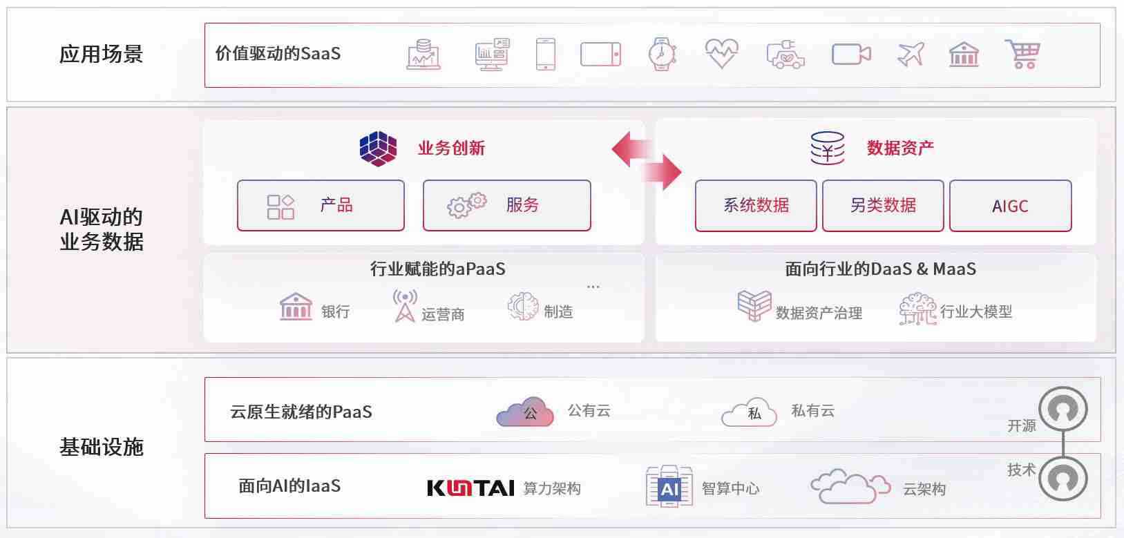 数字时代,,围绕企业数字化转型的关键要素,,,,尊龙旗舰厅数码开创性的提出数云融合战略和技术体系框架,,着力在云原生、、数字原生、、AI原生和信创产业上架构产品和服务能力,,,为处在不同数字化转型阶段的快消零售、、、汽车、、、、金融、、、医疗、、、、政企、、、教育、、、运营商等行业客户提供泛在的敏捷IT能力和融合的数据驱动能力,,,,构建跨界融合创新的数字业务场景和新业务模式,,,,助力企业级客户建立面向未来的核心能力和竞争优势,,,全面推动社会的数字化、、智能化转型升级。。。。