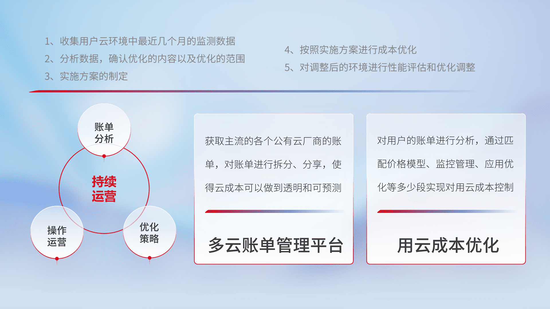 通过多云纳管,,以统一的资源数据模型把客户的云资源进行抽象和封装,,进而实现对多云资源的统一操作,,,,保障云资源管理的可靠性、、、稳定性与可用性。。。。量身定制化运维内容,,,,配置、、开发运维、、、、补丁管理、、、、备份、、监控、、、、认证和访问管理、、、、审计和日常巡检等,,,保障在用云过程中的可靠度,,,稳定度以及高可用率。。。